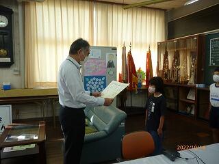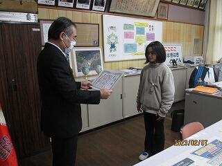 7日(火)に校長室で感謝状贈呈をしました。毎年、恒例となった校門前の門松づくりに材料を提供していただいている持永木材の方に、感謝状を贈呈し、お礼を気持ちをお伝えすることができました。