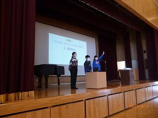 まず、校長先生のお話です。2月4日(土)に行われる都城市プレゼンコンテストの紹介、2月の目標「ろうかをしずかにあるこう」が達成できるように頑張りましょうというお話がありました。