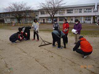休日にもかかわらず、PTA役員の方々、おやじの会のみなさんにも御協力をいただきました。ロープを引っ張りながら杭を打っていく作業はなかなか大変でしたが、御協力のおかげで予定通りに進めることができました。ありがとうございました。