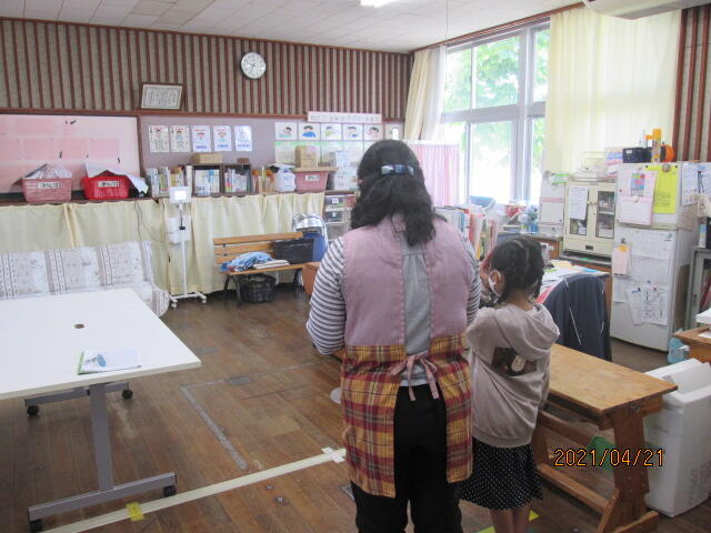 ここ最近は「視力検査」を保健室で行っています。反対の目を隠して片方の視力を測定するのですが、新型コロナウィルス感染防止対策として器具は使用せず、自分の手で反対の目を隠すようにしています。待っている時も、廊下でソーシャルディスタンスをとり、静かに待っています。