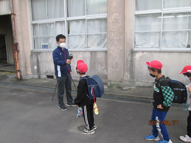 現在、県の緊急事態宣言が発令され、学校での感染対策も「国レベル3」の最も高いものになっております。毎朝、先生方がローテーションを組んで、東門・西門で登校してくる児童全員の体温測定を実施しています。