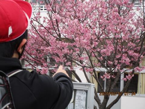 あれは、早咲きの桜です。八重桜だと思います。きれいですね。桜は300種くらいあるから、名前を探すの大変なのですよ。