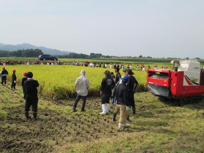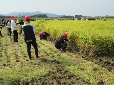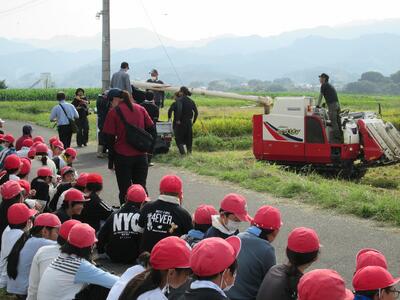 5年生が6月中旬に田植えを行いました。台風等の影響がなく、順調に稲が成長し、今日、子どもたちが鎌を使って稲刈りをすることができました。これまでJA青年部の方々、お助け人の方々によって田を管理してきていただきました。大変ありがたく思っているところです。ありがとうございました。活動に入る前に、JA青年部の方が子どもたちが鎌を使って稲を刈りやすいように、コンバインを使って稲を刈り取ってくださいました。子どもたちは鎌を使って刈る人、刈り取った稲をコンバインの所まで運ぶ人など役割分担をしながら手際よく収穫したところです。今回、収穫したお米は、11月30日の上小まつりで白ご飯としてパック販売されることになっています。きっと美味しいご飯が食べられることでしょう。