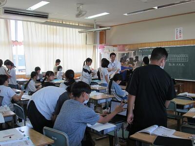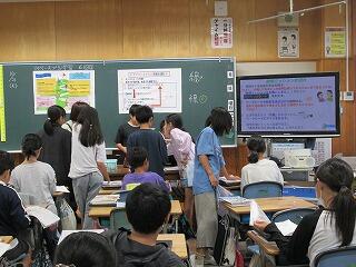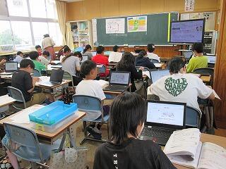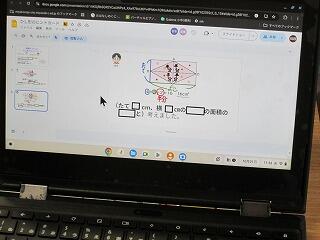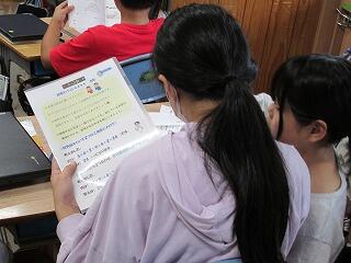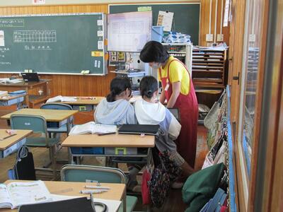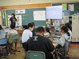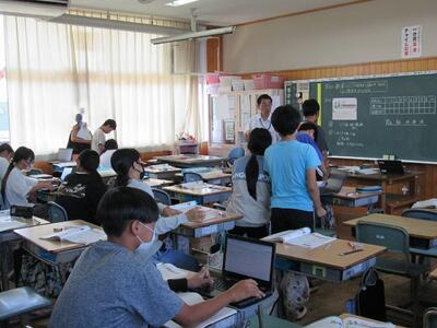 2時間目に6年生教室に行ってみると、算数専科の先生が黒板の前にいて、数名の子どもたちが取り囲んでいました。何か先生に質問して解決しようとしているようです。教室の中をぐるっと見渡してみると、タブレット端末を使って自分で考えている子ども、友だちと相談しながら問題を解決している子どもたちがいました。この様子から、今日の授業では子ども自身が解決方法を選んで問題解決に取り組んでいることが分かりました。授業のめあては、「①表に書いて、②順序よく調べて、③ちょうどよい場合を見つけよう。」です。このめあてを全体で確認すれば、めあての中に学習の流れ(①、②、③)が示されているので、子どもたちは自分たちで学習を進めることができます。先生はアドバイザー(相談役)を務めていて、他の子どもたちは自分が選んだ方法で真剣に問題解決に取り組んでいて、教室内に熱気がありました。子どもが主役の授業です。最後に、問題の答え合わせがあったと思いますが、結果はともあれ、子どもたちは満足感と納得感を得られたのではないでしょうか。