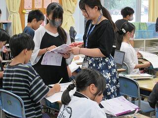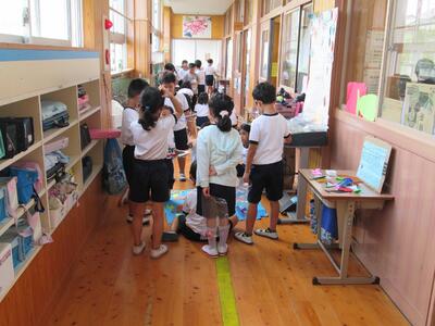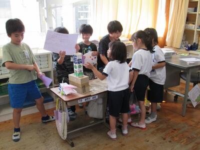 2年教室や廊下から楽しそうな声が。何をしているのだろうと近づいてみると、2年生ではなく、1年生が手作りおもちゃで遊んでいます。2年生の生活科の授業「おもちゃまつり」をしていました。これは2年生が1年生を招待して1年生に自分たちが作ったおもちゃで遊んで楽しんでもらおうというものです。作ったおもちゃを見てみると、迷路や釣り、パッチンジャンプ、ぴょんコップなどいろいろなおもちゃができていました。1年生は順番にいろんなおもちゃで遊んでいました。1年生がおもちゃで遊ぶ前に、2年生が1年生におもちゃの遊び方を優しく説明していたところが心に残りました。この様子を見て、2年生がすっかりお兄さん、お姉さんになっていてびっくりしました。今回の「おもちゃまつり」は、2年生と1年生のとてもよい交流の場になったようです。来年度の今頃は、今回、おもちゃで遊んだ1年生が、新しく入学してくる1年生に手作りおもちゃを作って、おもちゃの遊び方を説明していることでしょう。