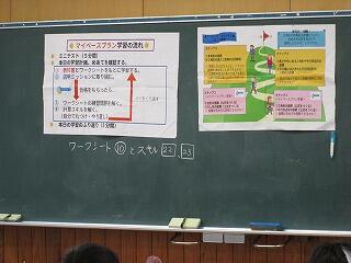 5年生の教室に行ってみると、算数の授業をしていました。みんな黙々と問題を解いています。先生の説明がありません。黒板に目をやると、左側には「マイペースプラン学習の流れ」、その右側には「ラーニング・マウンテン」というものが貼ってありました。子どもたちが黙々と問題を解いていたのは、この時間の学習の流れが分かっていて、自分のペースで学習を進めているからだと分かりました。みんな集中していて、とてもよい雰囲気でした。このような流れで毎時間の学習を進めていけば、子どもたちは自ずと学び方を学んで、自分で学習を進めていけるようになります。もう一つの「ラーニング・マウンテン」という山の絵を見れば、子どもたちがすべての学習が終わった時にどのような力を身に付けなければならないのかが分かるようになっています。また、その力を身に付けるためにどのような学習(ステップ1~ステップ4)に取り組んでいくのかが理解できて、ある程度、子どもたちが見通しをもって学習に取り組むことができます。5年生の算数の授業でも、子どもが主役の授業を目指して、試行錯誤しながら取り組んでいます。