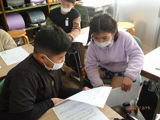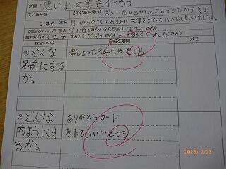 題材は「学級の思い出文集を作ろう」で、みんなで学級文集の名前を考えたり、どんな内容にするかを決めたりなど、活発な話合いが見られました。この時間のめあてである、「友達の意見を最後まで聞く」「自分の意見を進んで発表する」「友達のいいところを発表する」が達成されていたようです。