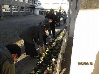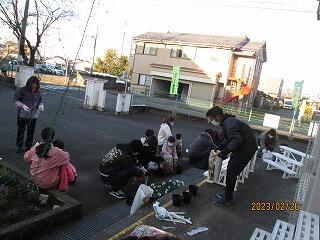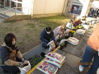 2月26日(日)の7時30分より花の苗植えをしました。参加していただいたのは、環境整備部の方と一人一役の方です。朝早く寒い中での作業でしたが、約30名の皆様が参加していただきました。