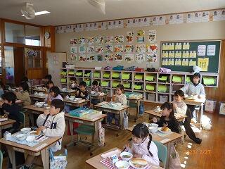 1年生の教室に入り、国語や算数の授業や給食指導、清掃指導の様子を参観されました。