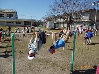 昼休み時間の運動場でも、エリアを分けた上で3つの学年が遊べるようになりました。遊具の使用も可能になり、子どもたちの歓声が響き渡っています。1年生に話を聞くと、「昼休み時間がとっても楽しい。」と笑顔で話していました。