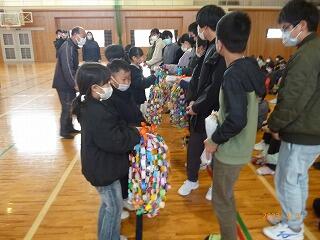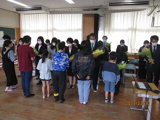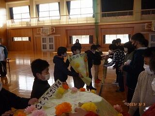卒業する6年生に、1年生から5年生が手作りしたプレゼントを渡して、これまで最高学年として上小をリードしてくれた6年生に感謝を伝えてくれました。