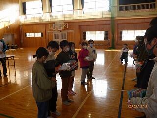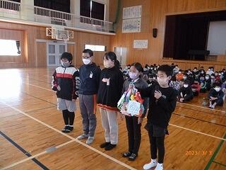 6年生からの贈り物もあり、ほのぼのとした雰囲気で会が進みました。笑いや笑顔のあふれる集会となりました。