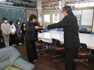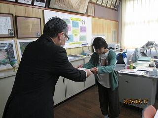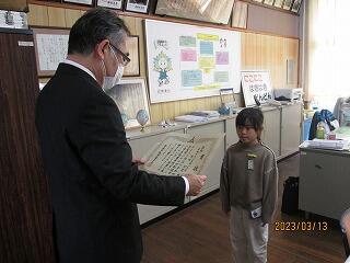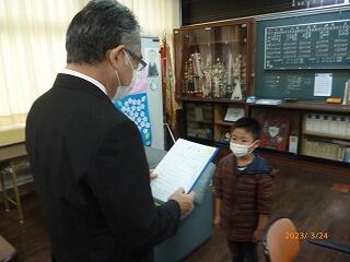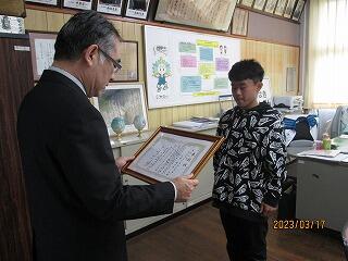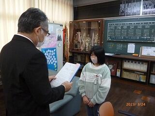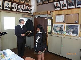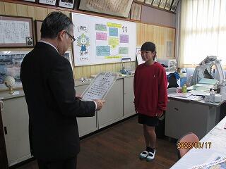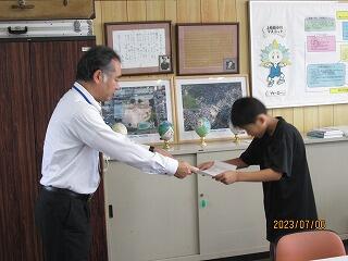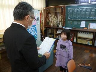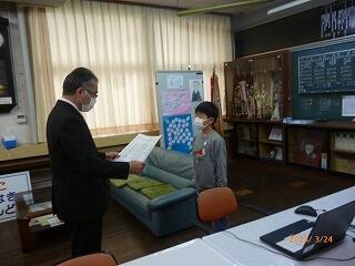 次に、スポーツ部門で九州大会優勝という素晴らしい成績を収め、妻ヶ丘地区善行児童として表彰されました。こちらも表彰式が中止となったので、校長室で校長先生から賞状を渡していただきました。