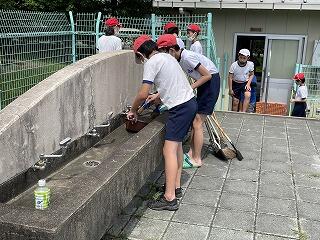 今日は、2年生が芋づくりをしている畑の草取りを行いました。暑さ指数はオレンジの厳重警戒となっていたので、草取りの時間を予定より短くし、水分補給をこまめにすることで、熱中症への対応をしました。