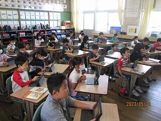 今日は、1年生の各クラスで「おいろぐ」の作成をしました。ICT支援員の先生に教わりながら、紙のワークシートに記録したことをタブレット端末で撮影し、データとして保存するという活動でした。1年生は支援員の先生の話を聞きながら、「おいろぐ」を作ることができました。