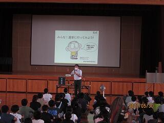 講話では、市教育委員会生涯学習課社会教育指導員の橋之口修先生を講師にお迎えし、「メディアの使用について」という視点から、様々なことを教えていただきました。児童が体育館を退出した後は、保護者向けにも注意点などを教えていただきました。