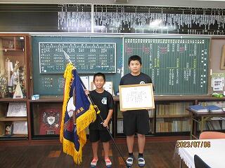 表彰状と優勝旗を代表児童に校長先生から渡してもらいました。日頃の努力が実を結び、更なる自信につながったのではないでしょうか。「今後も、大会や遠征などがあるので、頑張っていきたい。」と話してくれました。優勝、おめでとうございます。