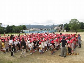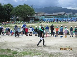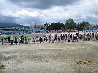 昨日も時折、大雨が降り、人文字のラインが書けなかったので、計画を変更し、運動場のトラックに児童を並ばせて、2つの大きな楕円を作り、航空写真を撮りました。熱中症の対策もしながらでしたが、出来上がりが楽しみですね。
