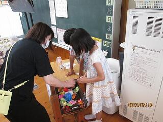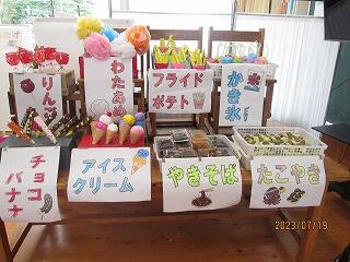 お祭りの案内、カード、景品など全てを自分達で準備をしていました。お店やブースを運営するグループ、お祭りの出店に行くお客さんのグループに分かれて、時間になったら交代をして、みんなで楽しい夏祭りをしていました。先生達にも招待状やチケットを配ってくれていたので、校長先生達も楽しそうに参加していました。