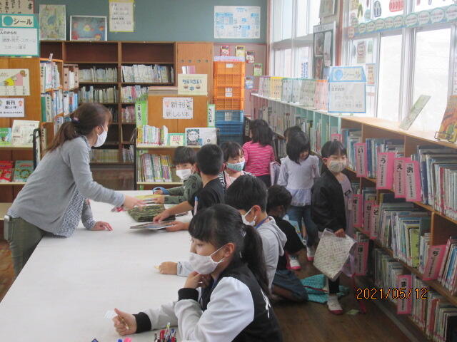 昨年度、一年間の図書の貸し出し冊数は、なんと57481冊になります。児童一人あたり79冊の本を読んでいることになります。今日の給食時間には、図書館サポーターの先生が放送で読み聞かせもしてくれました。
