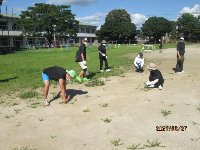 最近、朝、運動場には6年生の姿があります。運動場の草取りをしてくれているのです。朝、登校して準備が終わった人で時間のある人は運動場に出てきてくれます。