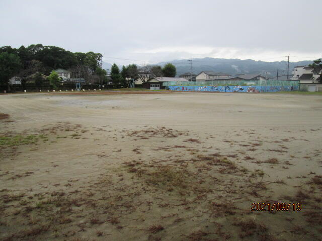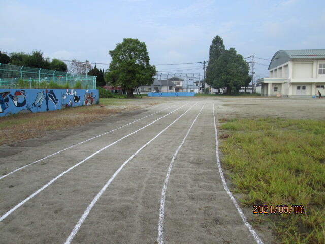 夏休み後半から、運動会の練習に向けて運動場整備に職員で取り組んできました。特に、トラック(子ども達が走る)内の除草作業が手作業のため、長い時間かかりながら一日一日少しずつ進めてきました。写真に写っている場所は夏休み中、トラック内もほとんど草が生い茂っていた部分ですが、これまでの地道な職員作業と日曜日の早朝PTA会長など有志の方々が作業していただき、立派な状態になってきました。
