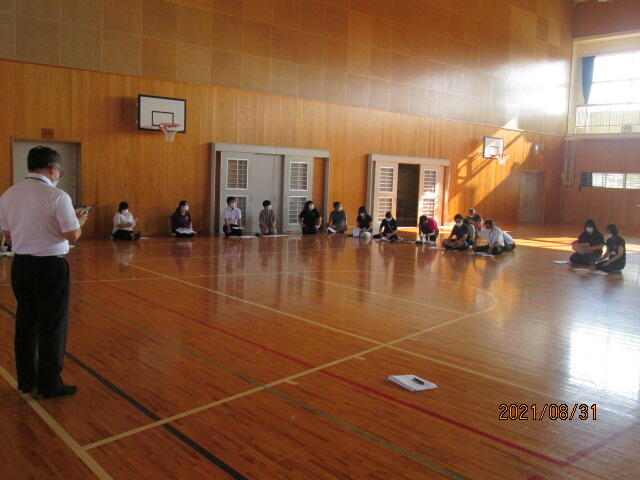 本校では週1回、火曜日の朝の活動の時間帯に職員朝会を開催し、様々な全体での連絡・確認をしてきています。現在、この会議も感染防止対策として、体育館で実施しています。感染者数は減少してきましたが、気を緩めることなく対策を続けていきたいものです。