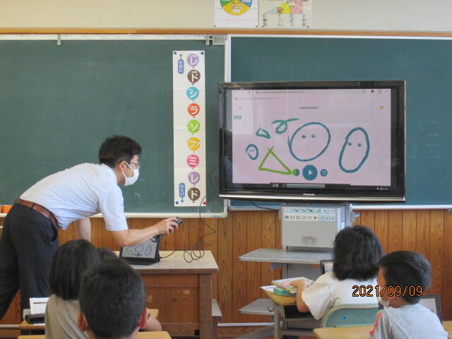 このアプリは、子どもが描いた絵に音がつき、短い曲のようになり、音作りや曲作りを体験できるものになります。それぞれが作った曲を大型テレビを通してみんなで鑑賞していました。拍手も聞こえていました。