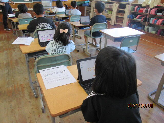 音楽は、現在、感染対策で合唱や合奏など活動に制限があるので、なかなか普段の授業対応ができにくい中ですが、PCを使って楽しく活動していました。
