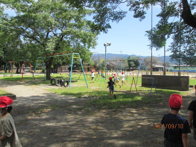 昼休みの様子です。新型コロナウイルス感染防止の観点から、現在、昼休み時間に外遊びができる学年を制限しています。本日は、外遊びができるのは1年生、2年生のみで、他の学年は室内で過ごしています。また、運動場を真ん中で区切って、学年が混じって交流しないようにしています。接触を伴う遊びや遊具・ボールも使用できません。