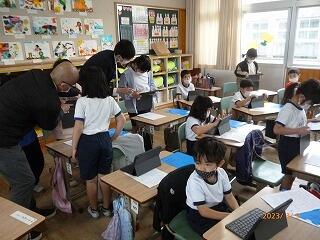 今日は、1年生の各クラスで「おいろぐ」の作成をしました。ICT支援員の先生に教わりながら、紙のワークシートに記録したことをタブレット端末で撮影し、データとして保存するという活動でした。1年生は支援員の先生の話を聞きながら、「おいろぐ」を作ることができました。