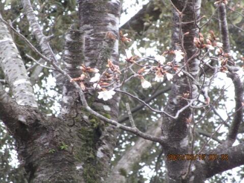 あれは、早咲きの桜です。八重桜だと思います。きれいですね。桜は300種くらいあるから、名前を探すの大変なのですよ。