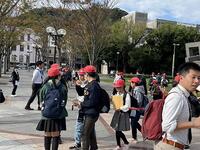 今、子どもたちが自主研修の出発地、中央公園を出ました。いよいよ自分たちで計画した訪問地を訪れて、鹿児島県の歴史を学びます。1日目のメインイベントなので、子どもたちはとても張り切っています。