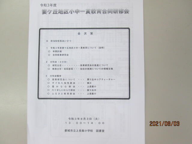 3日(火)の午後、妻ケ丘中校区の東小、上長飯小、妻ケ丘中の3校の小中一貫教育の推進に係る部会が本校を会場に行われました。新型コロナウイルス感染防止の観点から、全職員が一同に会することはできませんでしたが、各部代表者に集まってもらい、今年度の共通実践事項などに関する話合いを行いました。