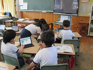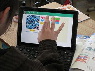 今、私たちの周りには、家電や自動車をはじめ身の回りの多くのものにコンピュータが使われ、生活を便利で豊かにしています。それは、まるで「魔法の箱」のようです。一方、それはどのような仕組みで動いているのか分からないブラックボックスとも言えます。あらゆる活動でコンピュータ等を活用することが求められるこれからの社会では、コンピュータを理解し、上手に活用していく力を身に付けることは、これからの社会ではどのような職業に就くとしても極めて重要になります。これが、小学校におけるプログラミング教育の導入の背景です。2年生の教室を覗いてみると、プログラミング教育に係る学習をしていました。指示を与えて、ロケットをゴールまで移動させるものです。中には、友だちと相談しながらロケットをゴールまで移動させる指示の出し方を考えている子どもたちがいて、とてもよい雰囲気でした。
