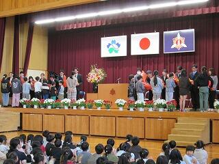 別れの春。今日は3月末をもって、本校を去られる13名の先生方とのお別れの式(離任式)を行いました。はじめに、校長が退職者及び転出者を紹介した後、13名の先生方、お一人お一人から子どもたちに話をしていただきました。話を聞きながら、いろいろな思いをもって本校を去られることが分かりました。次に、5年生代表児童が感謝の気持ちを込めて、先生方一人一人に対して自分の言葉でメッセージを伝えました。最後に、各学級の代表等がステージに上がって、本校を去られる先生方に感謝の言葉を添えて花束を渡しました。退場は、子どもたちが学年ごとにアーチを作り、本校を去られる先生方がその中を通って体育館をあとにしました。勤務年数に長短はあるものの、13名の先生方には本校の児童のためにそれぞれの立場で尽力していただき、心から感謝しています。ありがとうございました。