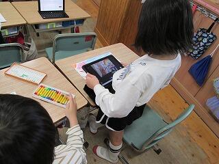 2時間目に校内を回っていると、2年生教室では子どもたちがタブレット端末を持って何かを撮っていました。教室に入って確認してみると、タブレット端末のカメラ機能を使って自分が描いた絵を撮っていました。おそらく、タブレット端末を持って帰って、おうちの人にその絵を見てもらうのでしょう。2年生は1年生の時、タブレット端末のカメラ機能を使ってあさがおの成長を記録したり、図画工作の時間に作った粘土の作品を保存したりした経験があるので、先生の力を借りなくても自分たちでその作業をどんどん進めることができていました。その様子を見て、2年生のすごさを感じたところでした。
