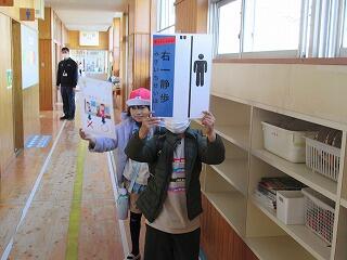 2年生の先生に用事があり、教室に向かっていると、児童用下足室前に子どもが2人いました。手に何かを持っています。近づいてそれを見てみると、「右一静歩(※廊下の右側を一列で静かに移動すること)」と書いてありました。それは本校の子どもが教室から別の場所へ移動する時の約束事です。子どもたちが手にしていたものは、2年生が各教室から児童用下足室に移動してくる時に、右一静歩を意識するようにと先生が準備したものでした。今、本校では、学校全体で右一静歩の徹底に取り組んでいます。先生方が子どもたちの発達の段階に応じて、指導が行き届くように工夫していることが分かりました。ありがたいことです。3学期も残りわずかとなってきました。右一静歩に取り組むことで、子どもたちが落ち着いた状態のまま学年末を迎えてくれることを願っています。