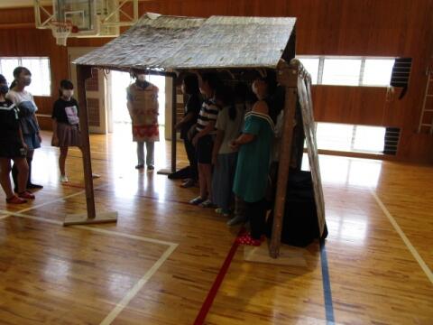 6年生は体育館で、市教委の埋文の皆さまによる、古墳時代体験活動。