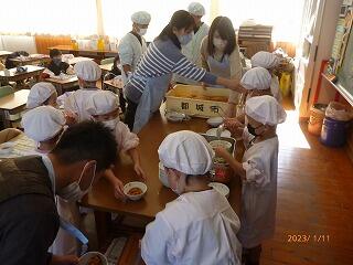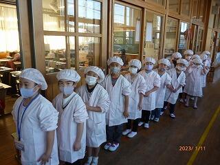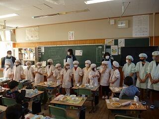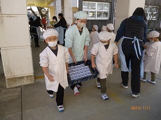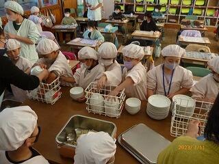 これまでは先生方や6年生のお兄さん、お姉さんに運搬や配膳などをしてもらっていましたが、今週から給食着を着て自分達でやっています。まだ、先生や6年生にサポートしてもらっていますが、頑張って自分たちで準備や片付けに挑戦しています。1年生の成長を感じました。