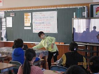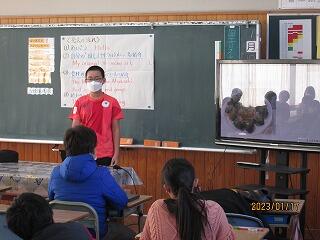 端末でスライドショーを作成し、英語やイラストを入れて、大型テレビでみんなに見せながら、英語で発表をしていました。また、その発表に対して聞いている人たちも英語を使ってリアクションをしていました。