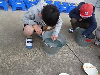 今朝も学級の前に準備していたバケツやお皿の水に、分厚い氷が張っているのを発見。冬を見つけて楽しんでいた1年生でした。