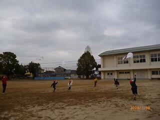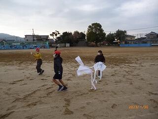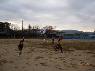「冬の遊びをたのしもう」という学習で作った凧で、それぞれお気に入りのイラストが描かれていました。風があまりなかったので、みんな全力で走りながら楽しんでいました。
