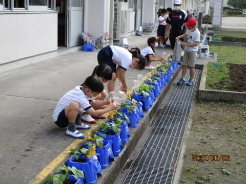 どんどん大きくなるアサガオに、一年生、毎日お世話をけんめいにしています。