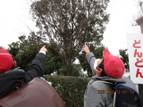 あれは、早咲きの桜です。八重桜だと思います。きれいですね。桜は300種くらいあるから、名前を探すの大変なのですよ。