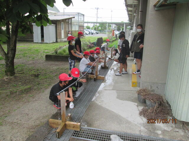 写真に写っている水道設備は、本校のPTAの皆さんのご厚意とご協力により、手作りで増設していただいたものです。今でも、大活躍です。これで手軽に手洗いができ、何より手洗い場の密を緩和するのに大変役立っています。