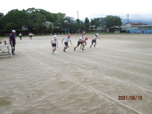 バトンパスやコースどりなど、子どもたちは話し合って競い合っていました。この成果は延期になった運動会で発揮させましょう。