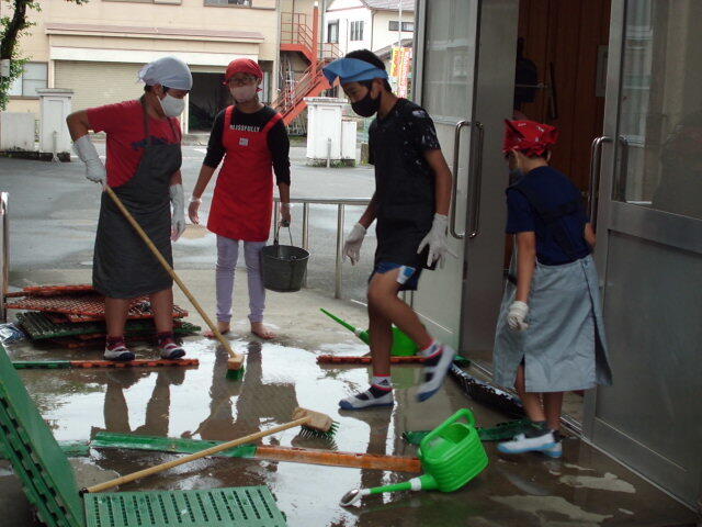 下の写真は、管理棟前の渡り廊下をきれいにしてくれている様子です。廊下の上にあるものも取って掃除してくれていますが、かなり汚れていました。自分たちで汚れている場所を事前に調べて行うので、掃除のやり方も工夫してやってくれていました。