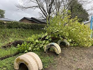 本日、台風で折れた枝などの片付けをしていると、4年生がプラタナスの木のところに来ていました。「プラタナスの木」という国語の学習の時に、何度も足を運んでいたようで、最後のお礼に来てくれていました。
