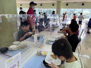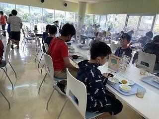 朝、出発した5年生は、入所式が終わり、自然の家内の食堂で昼食をとっています。